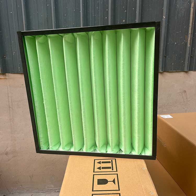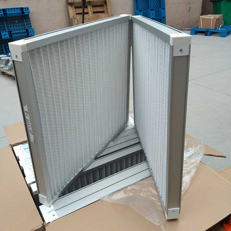 過濾材料是以折疊形式裝入高強度模切硬紙板內,迎風面積增大。流入的空氣中的塵埃粒子被過濾材料有效阻擋在褶與褶之間。潔凈空氣從另一面均勻流出,因此氣流通過過濾器是平緩和均勻的。視過濾材料不同,它所阻擋的粒徑從0.5μm到5μm而不同,過濾效率也不同 。